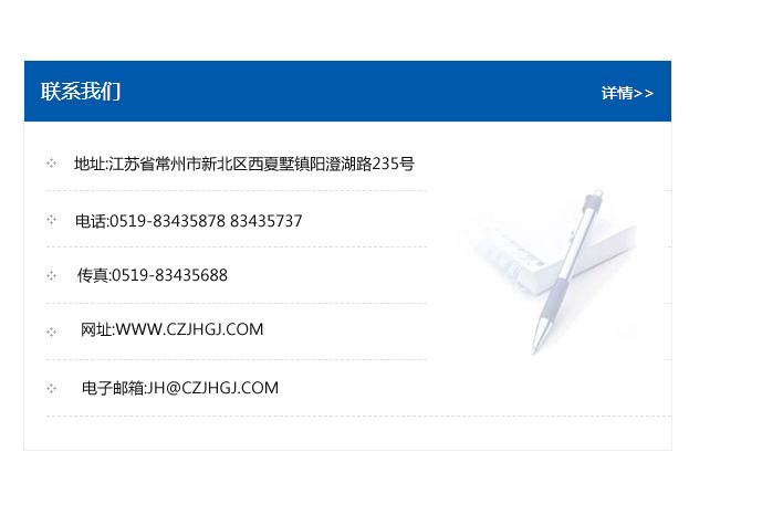 地址:常州市新北區友邦商務大廈1幢16、17層  電話:0519-85101652  傳真:0519-85112595  郵編:213022  網址:www_cz-jiayue_cn.wudezhai.com  郵箱:xiajifengaa@163.com